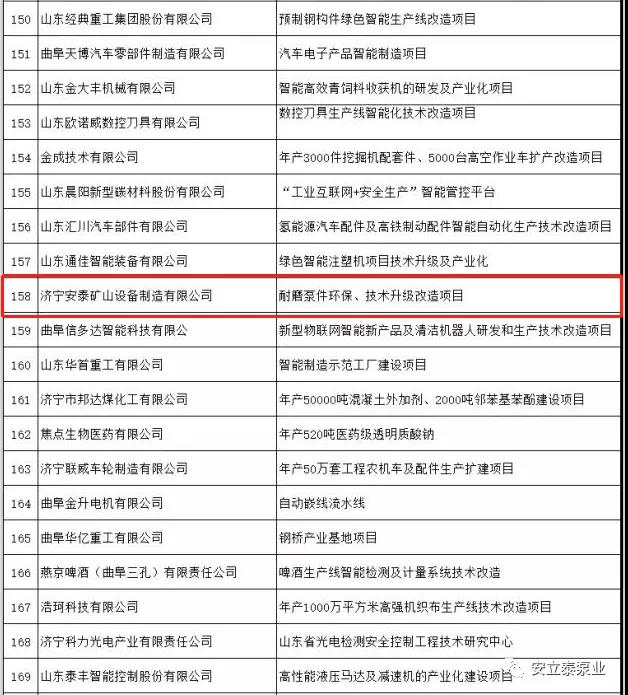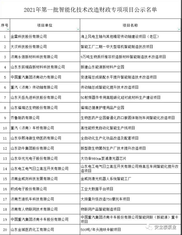 濟寧安泰礦山設備制造有限公司(簡稱安泰泵業(yè))經(jīng)企業(yè)申報、各市推薦、專家評審等環(huán)節(jié),入選列入2021年第 一批智能化技術改造財政專項項目名單,公示時間為2021年10月11日-15日(5個工作日)。
